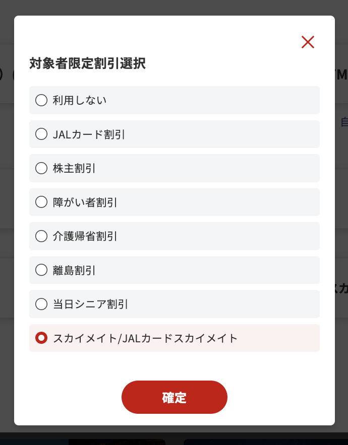 次に、”対象者限定割引”を押し、下方にある”スカイメイト/JALカードスカイメイト”を選択してください。選択したら”確定”し”検索”を押してください。