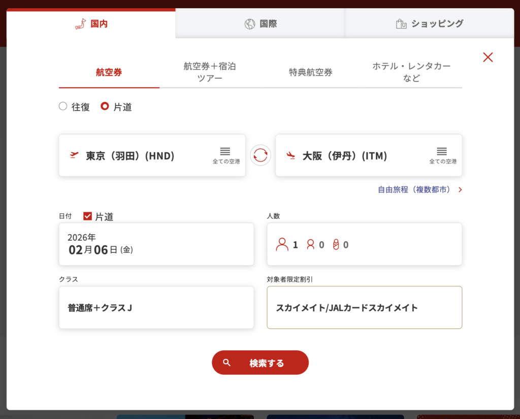 ログインができたら、航空券予約の画面にて「出発地」・「目的地」・「日付」・「人数」・「クラス」を選択してください。この時点でまだ、検索を押さないでくださいね。