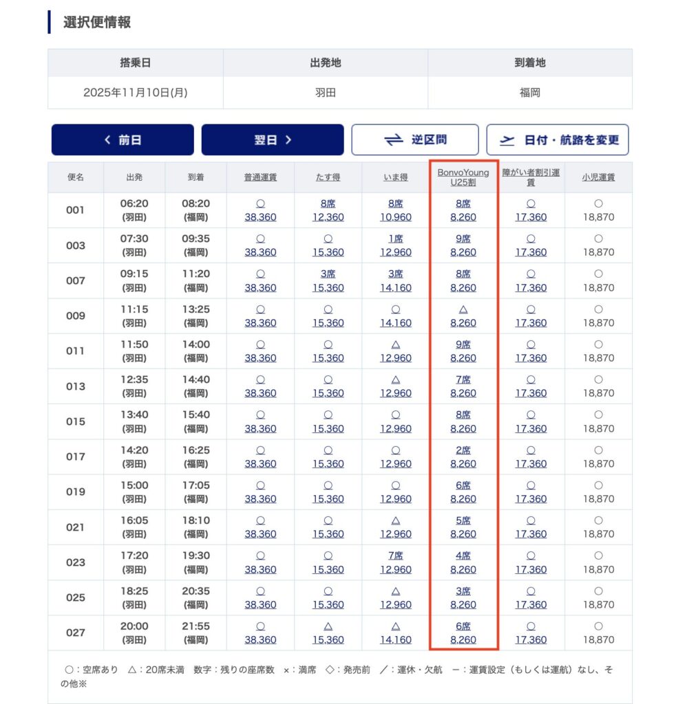 また、運賃に関して、搭乗日が異なるため直接的な比較が難しいのですが、9月28日現在の羽田〜福岡の航空券で比較してみると「スカイメイト」と「スマートU25」が約1.7万円なのに対し「BonvoYoung U25割」は約8千円とセール運賃に近い運賃で購入することができます