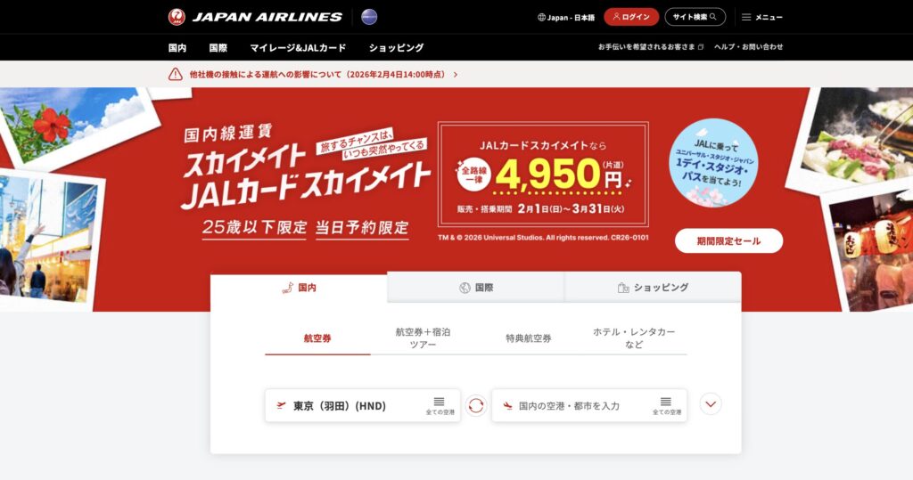 日本航空(JAL)では、満12歳以上25歳以下のJALカード会員またはJMB(JALマイレージバンク)会員の方を対象とした当日限定の割引運賃「スカイメイト/JALカードスカイメイト」を提供しています。搭乗日の0時から空席がある場合、JALの公式Webサイト(アプリ)や空港にて航空券を予約することができます。
